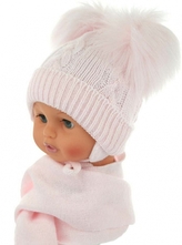 Zimní čepička s šálou - chlupáčkové bambulky - sv. růžová; 56/62 (0-3m)