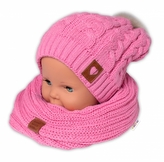 Zimní dvouvrstvá čepice s bambulí + komínek Love, růžová; 104/110 (3-5r)