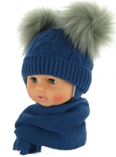 BABY NELLYS Zimní čepička s šálou - chlupáčkové bambulky - tm. modrá; 56/62 (0-3m)