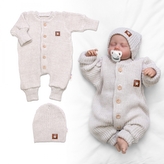 Rostoucí pletený oversize overálek + čepička Star, béžový melírek; 56/62 (0-3m)