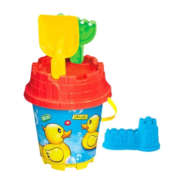 Plážový kbelík Ducks, sada obsahuje kyblík, lopatku, hrabličku a formu. Cena za 1 sadu. przeczytaj całość