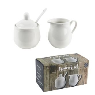 Ten zestaw zawiera dwa porcelanowe naczynia w czystej bieli, która podkreśli każdy wystrój stołu. Cukiernica jest kompaktowa, o średnicy 6,5 cm i wysokości 9 cm, idealna do przechowywania cukru lub innych drobnych słodzików. Mlecznik ma wymiary: średnica 5,5 cm, szerokość 9 cm i wysokość 7,5 cm, dzięki czemu pozwala na wygodne serwowanie mleka lub śmietanki do napojów i deserów.