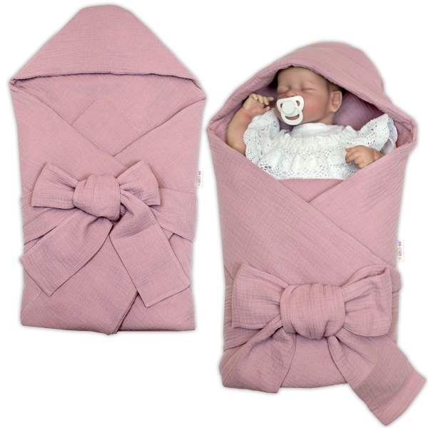 Luxusní mušelínová zavinovačka s kapucí na zavazování, pudrově růžová