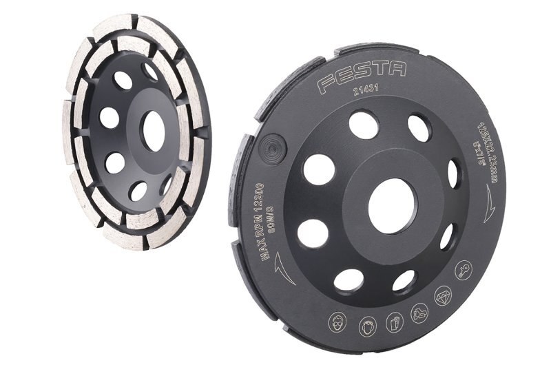 Brusný diamantový kotouč FESTA -dvouřadý, robustní nosný talíř je z pevné slitiny, speciální konstrukce uchycení diamantových segmentů k nosnému disku kotouče, vysoký obsah diamantového prachu v segmentech, použití : pro suché i mokré broušení mramoru, žuly, cihel, zdiva, přírodního i umělého...