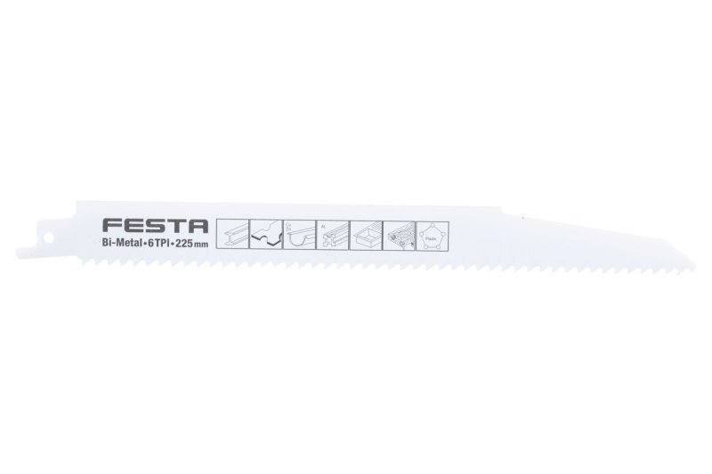 plátek pilový na kovy, plasty, dřevo - lamino - MDF - apod. s obsahem kovových částí do elektrické pily ocasky Bi - Metal - materiál odolávající většímu tepelnému zatížení, delší životnost ostří plátku doporučená maximální tloušťka řezu - plechy 5 mm, kovové profily a trubky 170 mm rozměry : 225 x 22 x 1.6 mm, počet zubů na palec (TPI) - 6 Instruktážní video