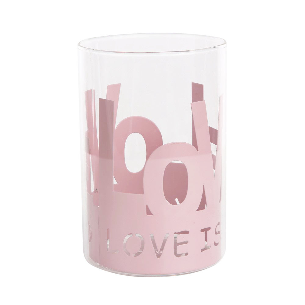 ŚKLENĚNÝ SVÍCEN V RŮŽOVÉM KOVANÉM OBALU 10X10X15CM - LOVE