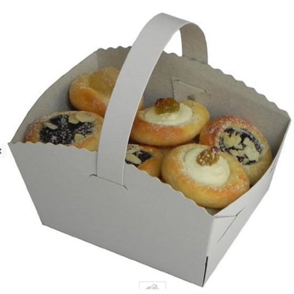 Koszyczek wykonany jest z wysokiej jakości białego kartonu, zaprojektowanego tak, by spełniać surowe międzynarodowe normy bezpieczeństwa żywności (BRC(G)S). Dzięki temu można go bez obaw używać w bezpośrednim kontakcie z tłustymi lub wilgotnymi produktami spożywczymi. Przy wymiarach 9 x 6 x 6 cm jest idealny do pojedynczych ciasteczek lub przekąsek, a jego praktyczny kształt ułatwia serwowanie i przenoszenie.
