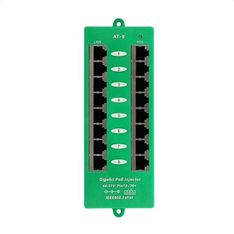 Panel integrující osm gigabitových POE injektorů s napájecím rozsahem 44-57V a max. proudem 550mA/port s podporou standardu 802.3af/at.Univerzální řešení pro vzdálené napájení většího počtu aktivních prvků s integrovaným extraktorem po UTP kabeláži.Vstup pro napájení prostřednictvím standardního...