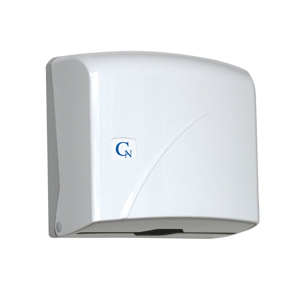 Wymiary głębokość, szerokość, wysokość:95x275x225 mm Ścienny dozownik na papierowe ręczniki z wąskim układem "Z" lub interfold o szerokości do 240 mm, o pojemności do 200 szt. Wykonany jest z białego tworzywa ABS z jasno szarą podstawą. Zajmuje niewiele miejsca i jest elegancki, należy do najmniejszych dozowników na ręczniki o standardowej szerokości. Można montować przy użyciu wkrętów lub taśmy samoprzylepnej.
