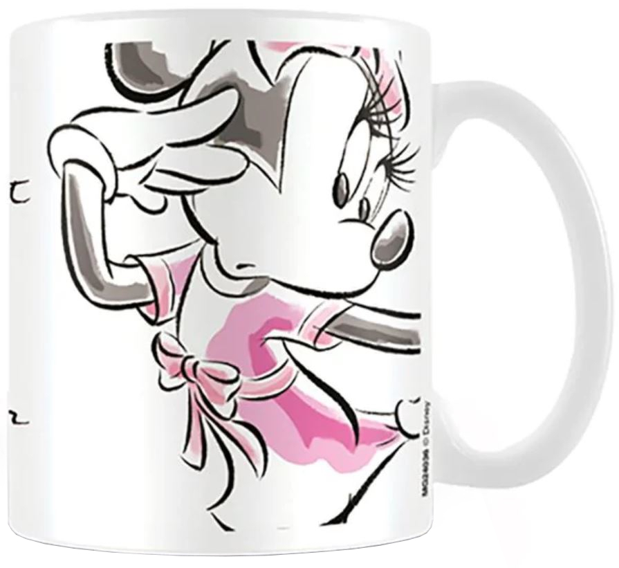 Bílý hrnek inspirovaný postavičkou Minnie Mouse z filmu Mickeyho Mouse.