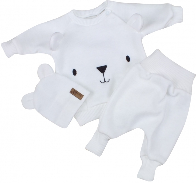Pletená kojenecká sada 3D Medvídek, svetřík, tepláčky + čepička Kazum, bílá, vel. 62; 62 (2-3m)