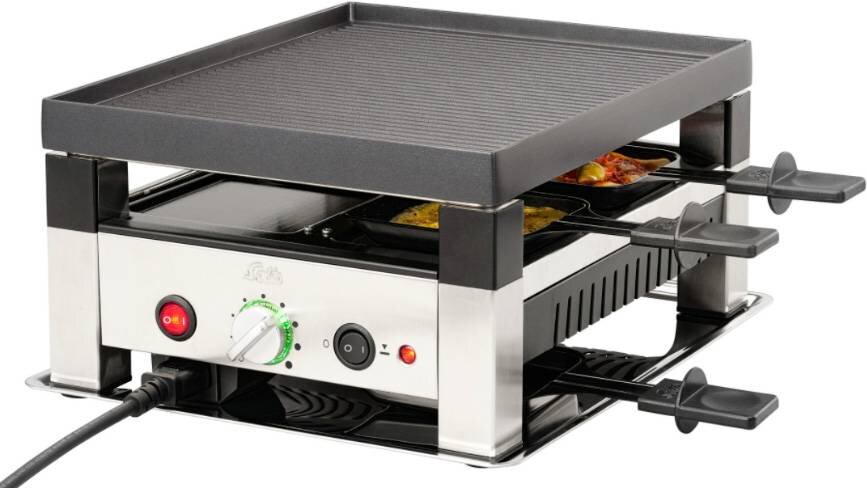 W zestawie znajdują się cztery nieprzywierające patelnie do raclette, cztery szpatułki oraz cztery mini patelnie wok, dzięki czemu możesz zaskoczyć gości różnorodnością smaków. Niskie dolne grzanie pozwala utrzymać przygotowane potrawy w cieple, a strefa chłodna oferuje miejsce do odkładania patelni, co zwiększa komfort podczas gotowania.