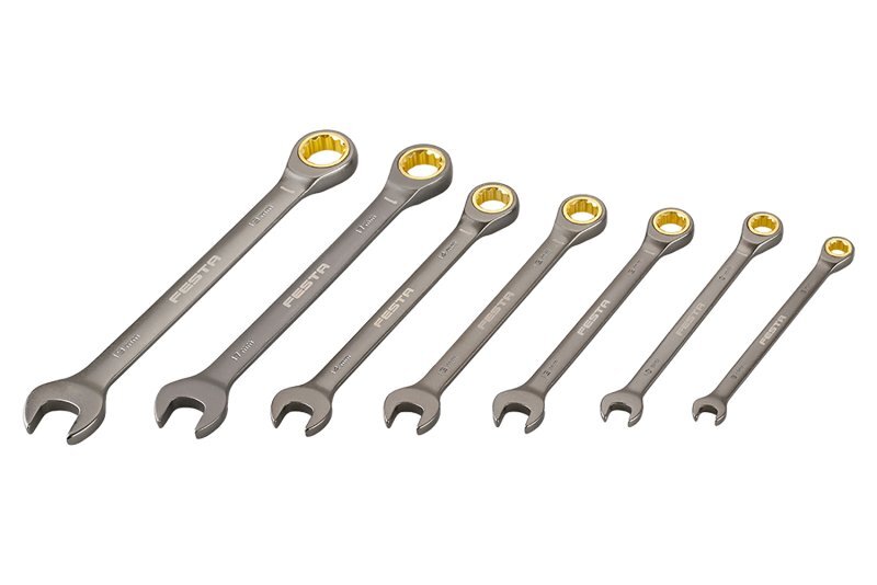 Sada nejpoužívanějších ráčnových klíčů FESTA pro použití s výhodou rohatky (ráčny). Klíče jsou vyrobeny kováním z kvalitní chrom-vanadové oceli. Tato ocel je zušlechtěná na požadované vlastnosti a povrchově upravená matným tvrdochromem pro dosažení optimální povrchové tvrdosti a odolnosti vůči korozivním vlivům. Kvalitou, tvrdostí a přesností přesně odpovídají normě DIN/ISO.