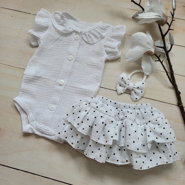 Mušelínová sukničkokraťásky, bodýčko a čelenka, 3D sada, bílá/dots, 68/74; 68/74 (6-9m)