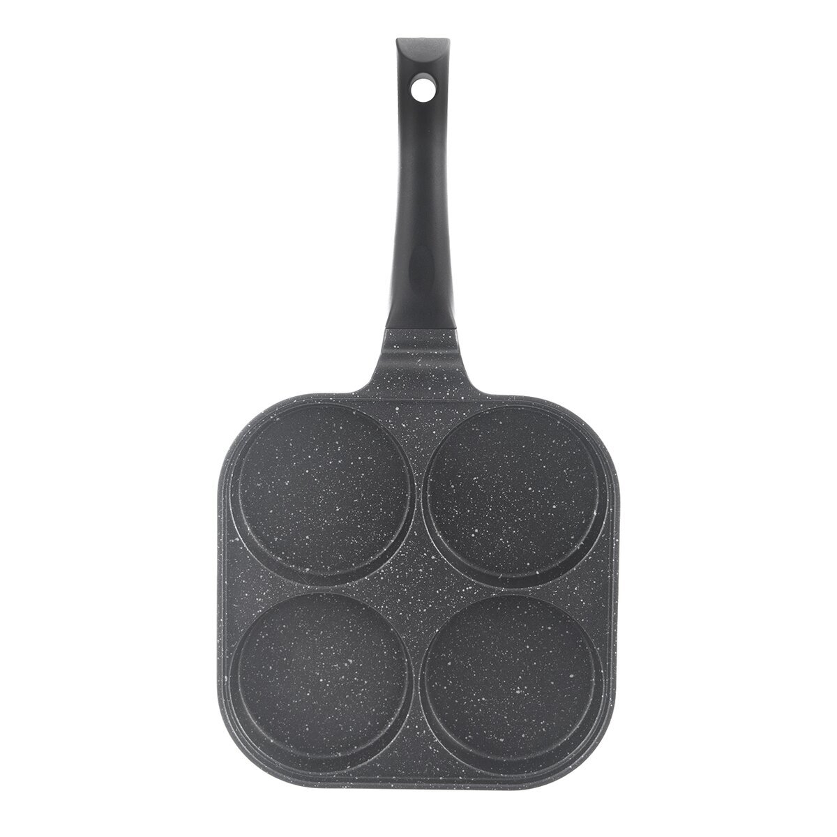 Kwadratowa patelnia do sadzonych jaj/placuszków to odlewana, masywna patelnia z 4 sekcjami i bardzo wysokiej jakości nieprzywierającą powłoką PFLUON GRANIT. Przeznaczona do przygotowywania sadzonych jaj, placków ziemniaczanych, małych naleśników itp. przy minimalnym użyciu tłuszczu. Wystarczająco głębokie sekcje 1,7 cm. Materiał: aluminium z doskonałą nieprzywierającą powłoką PFLUON GRANIT i profilowanym dnem, tworzywo (bakelit). Możliwość zawieszenia. Wymiary: 22x22 cm, wys. 2,7 cm, śr. jednej sekcji 10 cm, dł. 40 cm. Nadaje się do wszystkich typów kuchenek, w tym indukcyjnych. Zalecamy użycie rękawicy kuchennej. Możliwość mycia w zmywarce.
