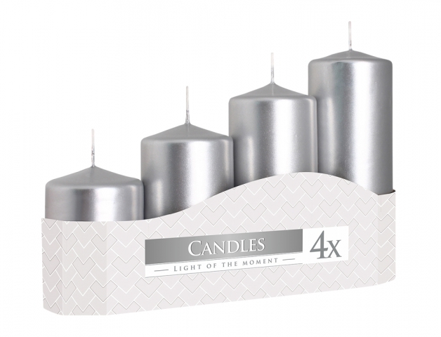 Lesklé stříbrné adventní svíčky ve tvaru válce setříděné dle výšky. Průměr 5 cm, výška: 7, 9, 11, 13 cm. Doba hoření: 11 hod, 16 hod, 22 hod, 33 hod. przeczytaj całość