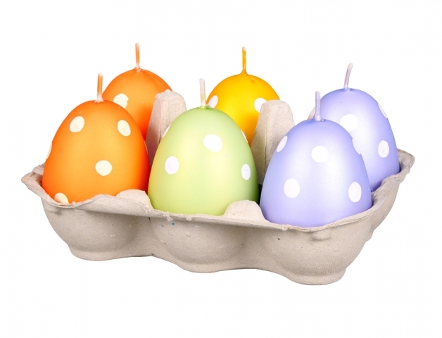 Velikonoční matná svíčka ve tvaru vejce zdobená bílými puntíky ve čtyřech barvách - oranžová, fialová, zelená a žlutá. Velikost svíčky: d4,5 x 6 cm. przeczytaj całość