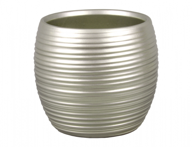 Keramický lesklý obal na květník zdoben proužky. Barva: chrom zlatá. Průměr: 15 cm. przeczytaj całość