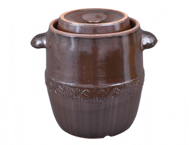 Keramický hnědý lesklý tzv. zelák s víčkem a s uchama. Do něj se nakládá a nechá kysat zelí. Jeho rozměry jsou: d.32 x v.34cm, objem 17l. przeczytaj całość