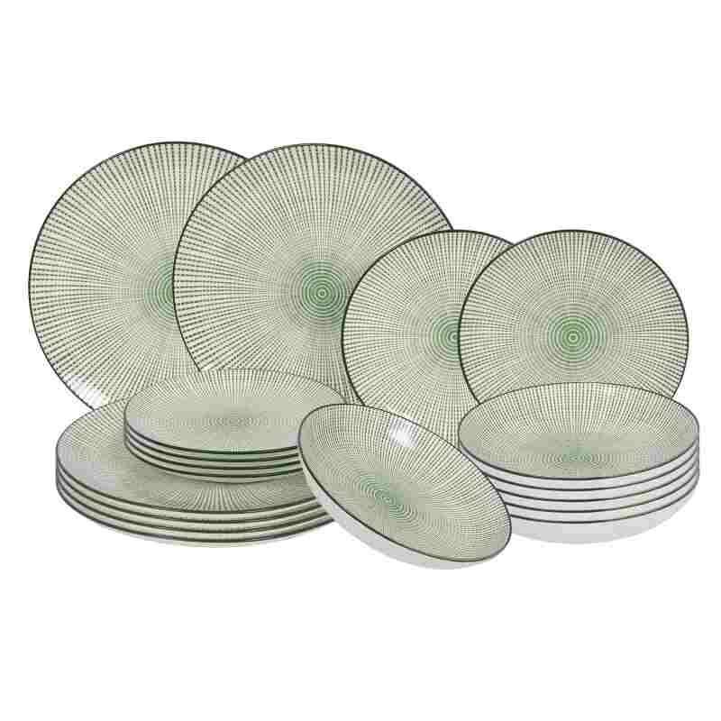 Obsah sady:- 6 plytkých talířů pr. 27 cm- 6 hlubokých talířů pr. 20,5 cm- 6 dezertníchh talířů pr. 19,5 cm- Barva: zelená/hnědá- Materiál: kamenina- Vhodné do myčky: Ano, ale doporučujeme ruční mytí przeczytaj całość