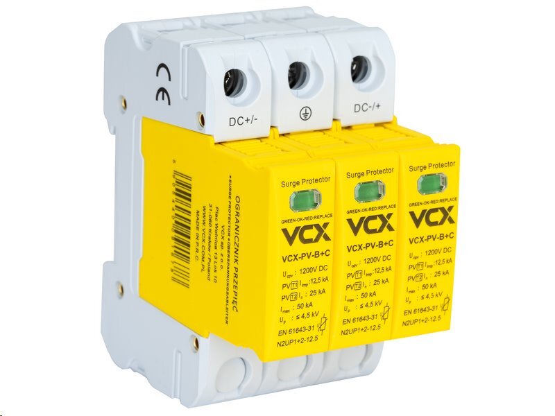Přepěťová ochrana VCX DC PV-B+C třída T1T2 (B+C) 3P 1200V 12.5kA Professional GOLDTechnicky vyspělá přepěťová ochrana nejvyšší kvality z nové řady určená pro ochranu fotovoltaických zařízení fungující jako ochrana přepětí třídy T1+T2 (B+C). Vybavená vizuálním indikátorem provozu (zelená -...