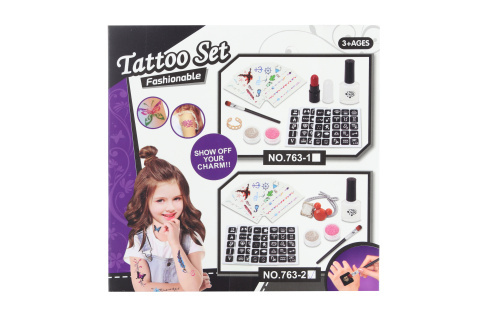 Sada obsahuje 5 malých archů tetovaček, 4 archy šablon, lahvičku s přípravkem k nanesení třpytek, 2 mističky se třpytkami, štěteček a náramek. Baleno v krabici. 18,5x18,5x2,5 cm. Věk 3+ przeczytaj całość