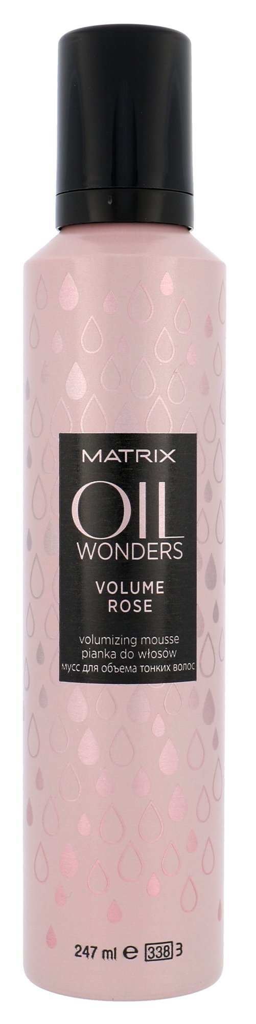 Pěna Matrix Oil Wonders Volume Rose Volumizing Mousse dodává vlasům objem bez zatěžování. Složení obsahuje šípkový olej, který pomáhá vlasy vyživovat a šetrně o ně pečuje. Pěna vlasům dodává jemnou fixaci.