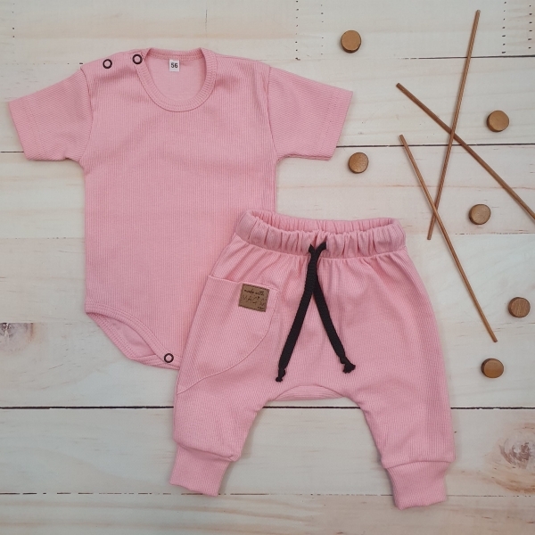 Žebrovaná souprava body kr. rukáv + tepláčky Magic, bavlna, růžová, vel. 80; 80 (9-12m)