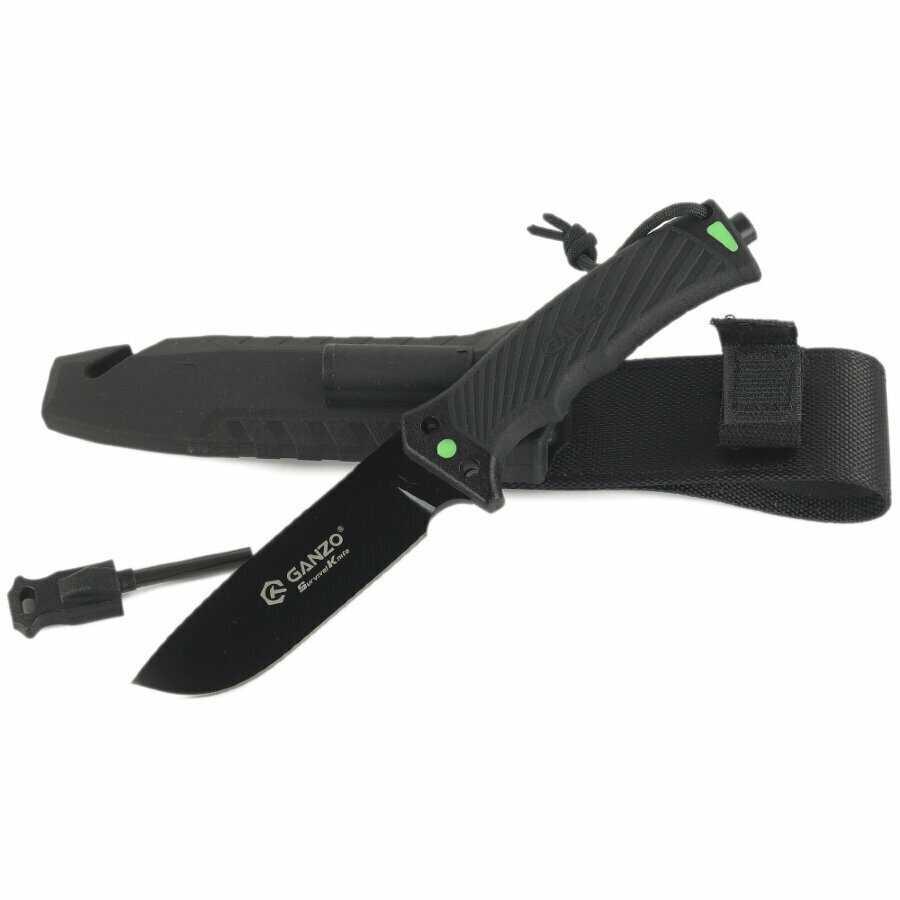 Ganzo Knife G8012V2-BK nôž do prírody 11,3 cm, celočierna, ABS, guma, plastové puzdro, kresadlo
