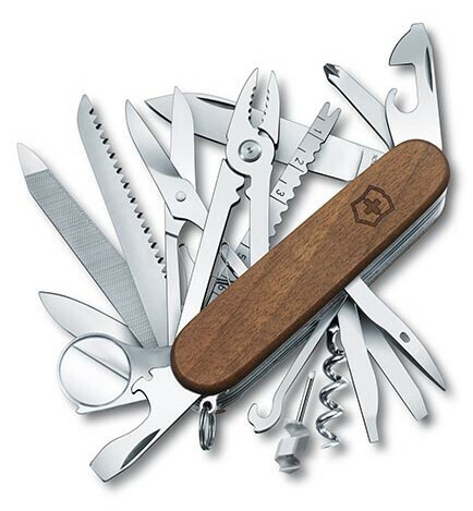 Multifunkčný vreckový nôž Victorinox SwissChamp Wood vo veľkosti 91 mm, s rukoväťou z orechového dreva.