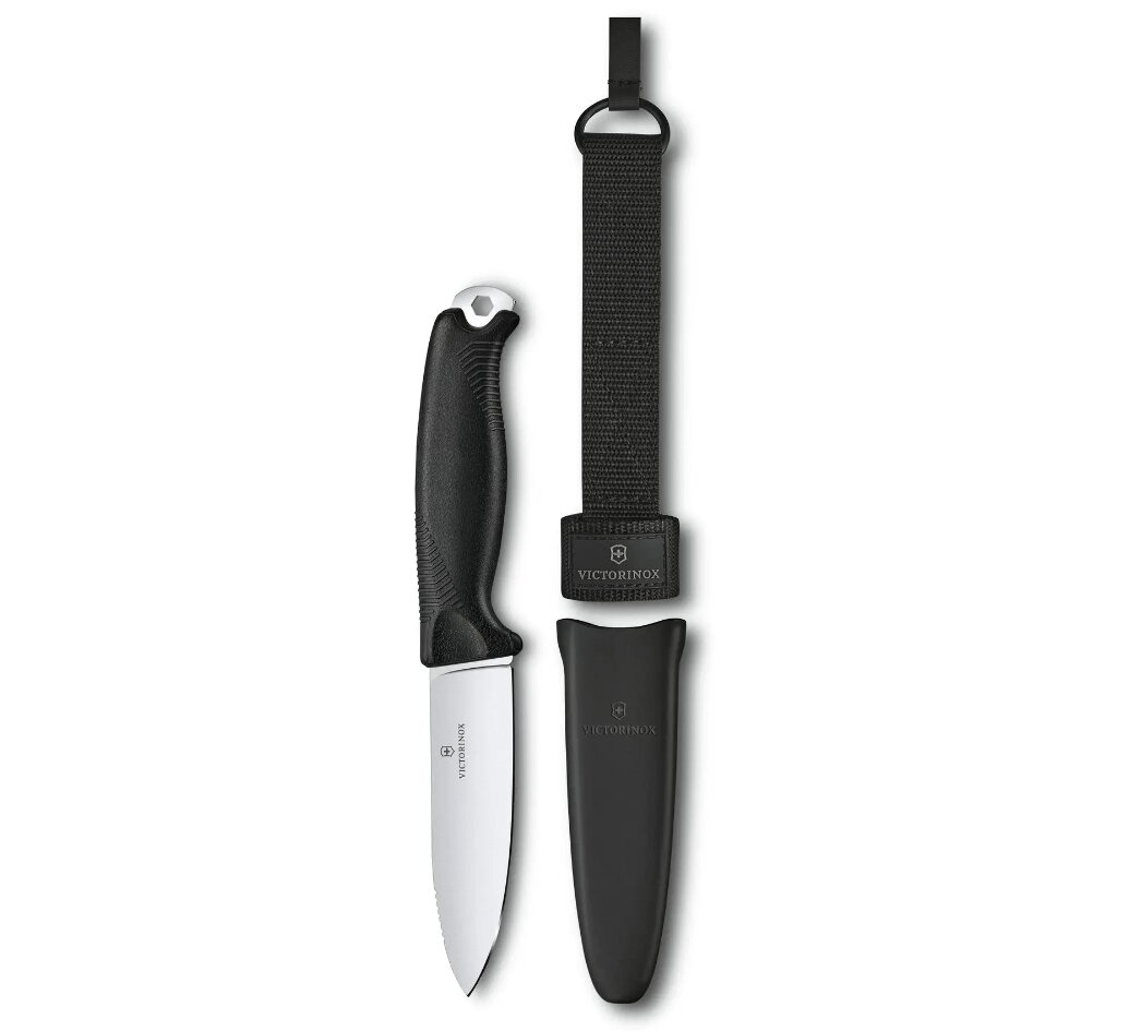 Všestranný nôž/dýka Victorinox Venture Black z kolekcie Venture pre bushcraft, turistiku, kemping, či prežitie. Má pevnú čepeľ typu Drop Point s hladkou hranou z nehrdzavejúcej ocele 14C28N a prechádza celým nožom (full-tang). Ostrý 90° chrbát umožňuje ľahké zapálenie ohňa za pomoci kresadla....