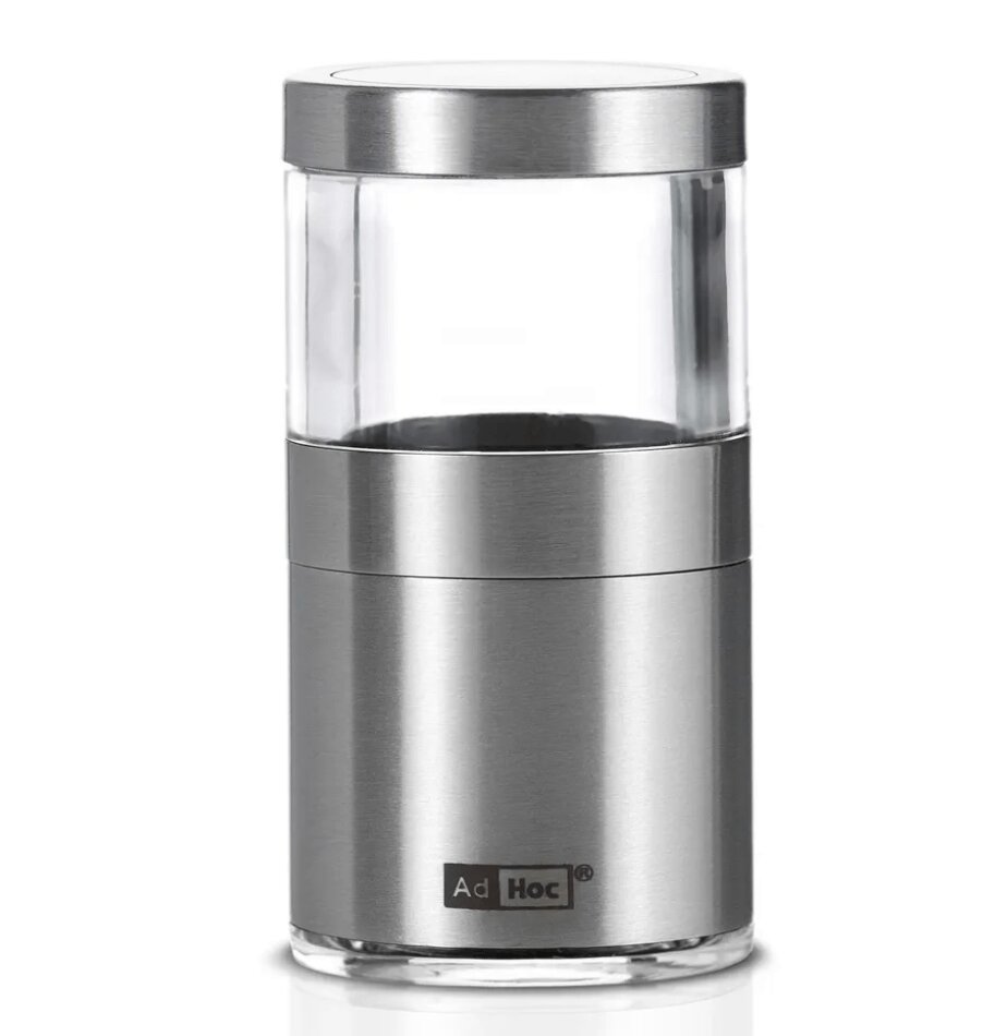 Mlynček na soľ a korenie AdHoc BASSO v optimálnej veľkosti s praktickým dizajnom, vyrobený z nerezovej ocele a akrylátu, s patentovaným mlecím mechanizmom CeraCut®.