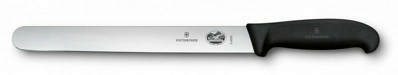 Krájací kuchynský nôž Victorinox Slicing Knife Fibrox vhodný na krájanie mäsa, šunky, salám a pod. So zaoblenou čepeľou s hladkou hranou s dĺžkou 30 cm z nehrdzavejúcej ocele. Rukoväť je z čierneho plastového materiálu Fibrox, ktorý znamenal pre Victorinox prielom. Možno ju sterilizovať do 150 °C...