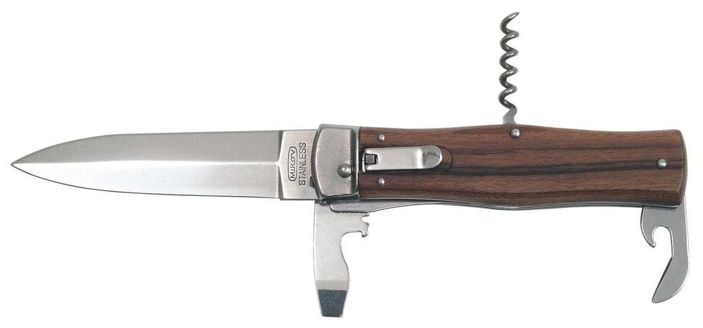 Posiada 4 funkcje - ostrze, otwieracz do butelek/śrubokręt/ściągacz izolacji przewodów, otwieracz do konserw oraz korkociąg.