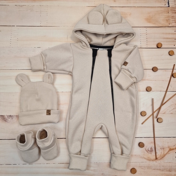 Oteplený dětský overal bez šlapek s kapucí, čepička + botičky, 3D, Kazum, béžový, vel. 68; 68 (3-6m)