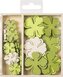 Zestaw jest starannie zapakowany w praktyczne drewniane pudełko o wymiarach 10,5 x 10,5 cm, co ułatwia przechowywanie i wygodne porcjowanie ozdób. Motywy w rozmiarach 2 cm i 3,8 cm występują w delikatnych, naturalnych kolorach - kość słoniowa, zielony i jasnozielony - dzięki czemu można dopasować dekorację do każdego stylu i okazji.