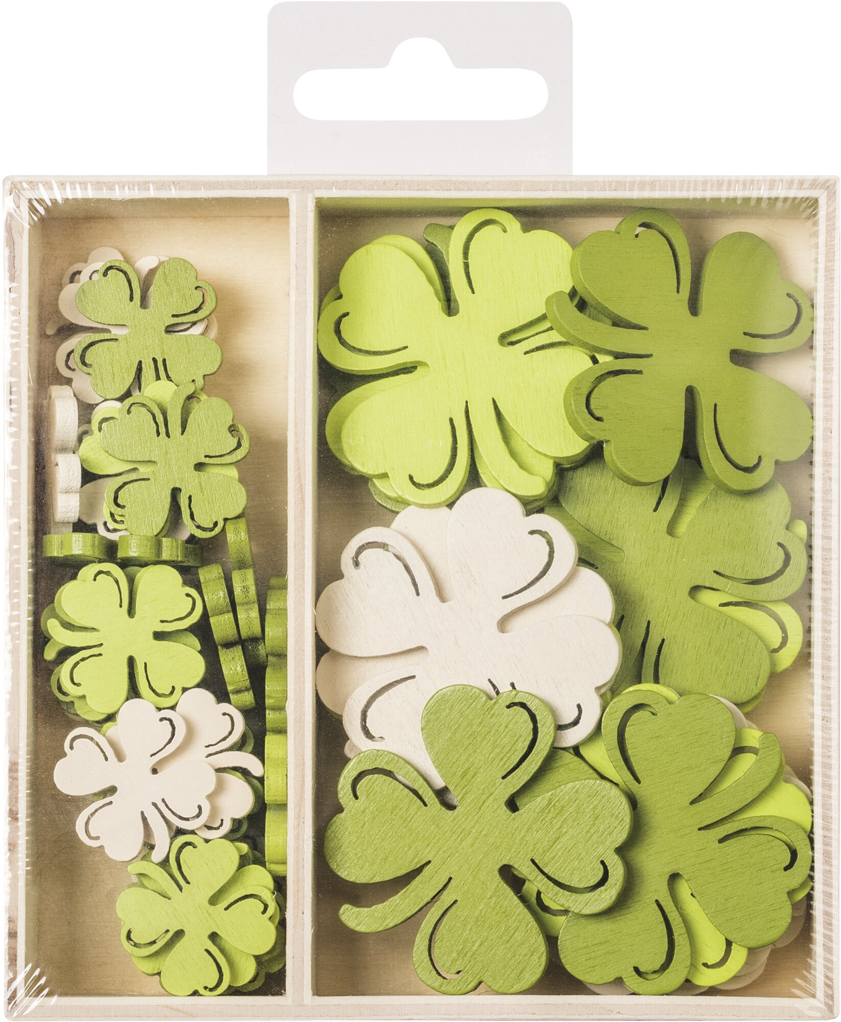 Dřevěné ozdoby v boxu 54ks - čtyřlístky - 2 velikosti, rozměr motivů: 2 cm, 3,8 cm.