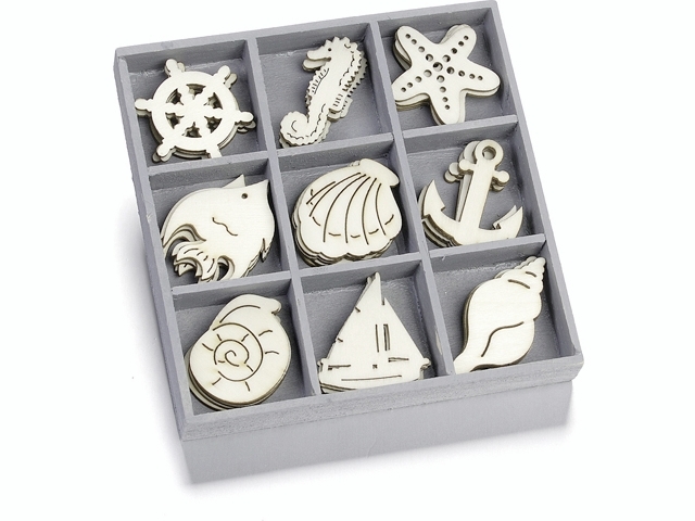 Dřevěné ozdoby v boxu 45ks - mořský svět - 9 motivů po 5 ks, rozměr motivu: 3x3cm.