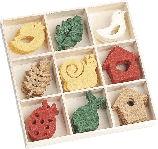 Filcové ozdoby vhodné pro dekorační zdobení, výrobu přání, dětskou tvorbu. Baleno v dřevěné krabičce 10,5 x 10,5cm. przeczytaj całość