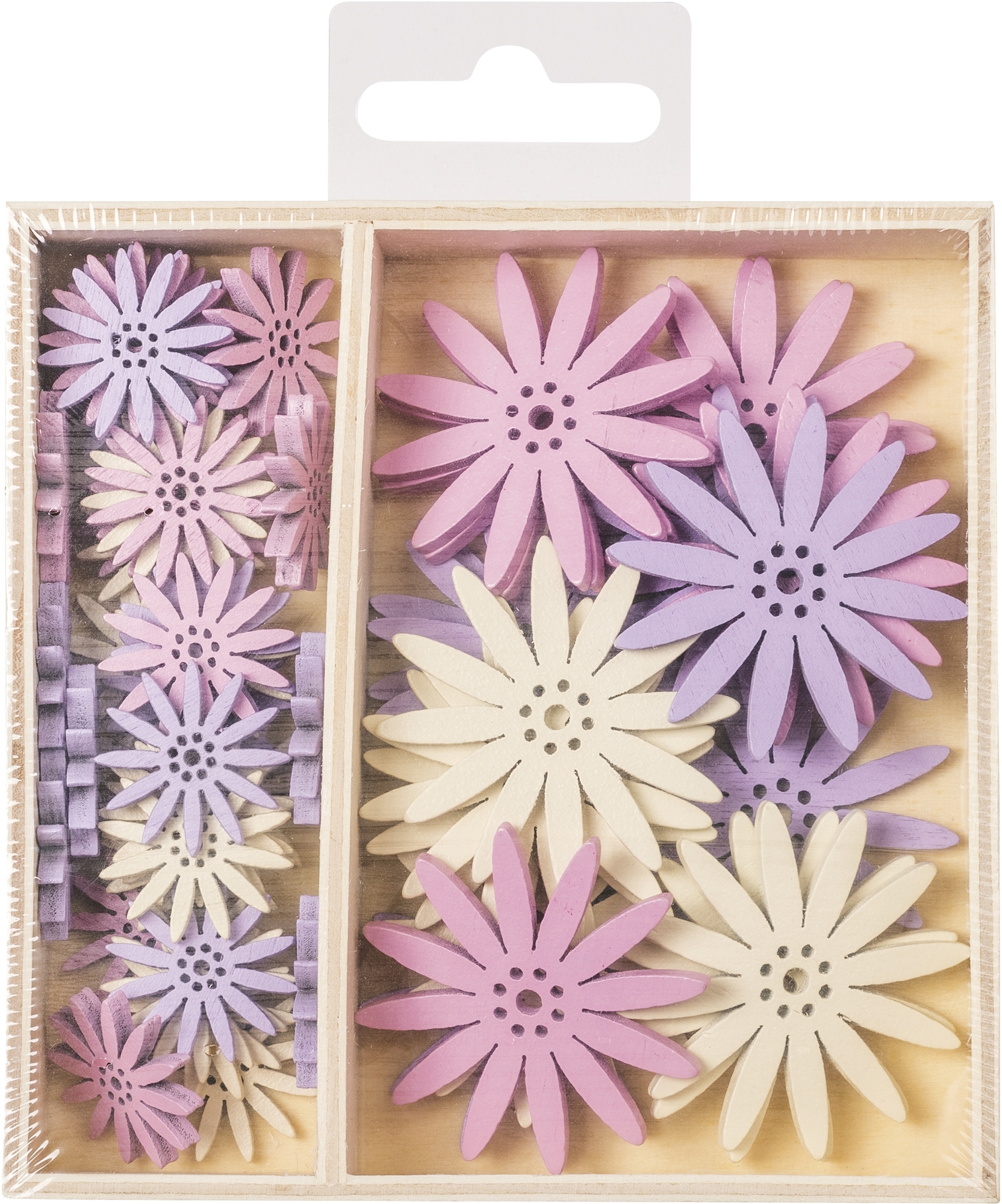 Dřevěné ozdoby v boxu 54ks - kytičky - 2 velikosti, rozměr motivů: 2,2 cm, 4 cm.