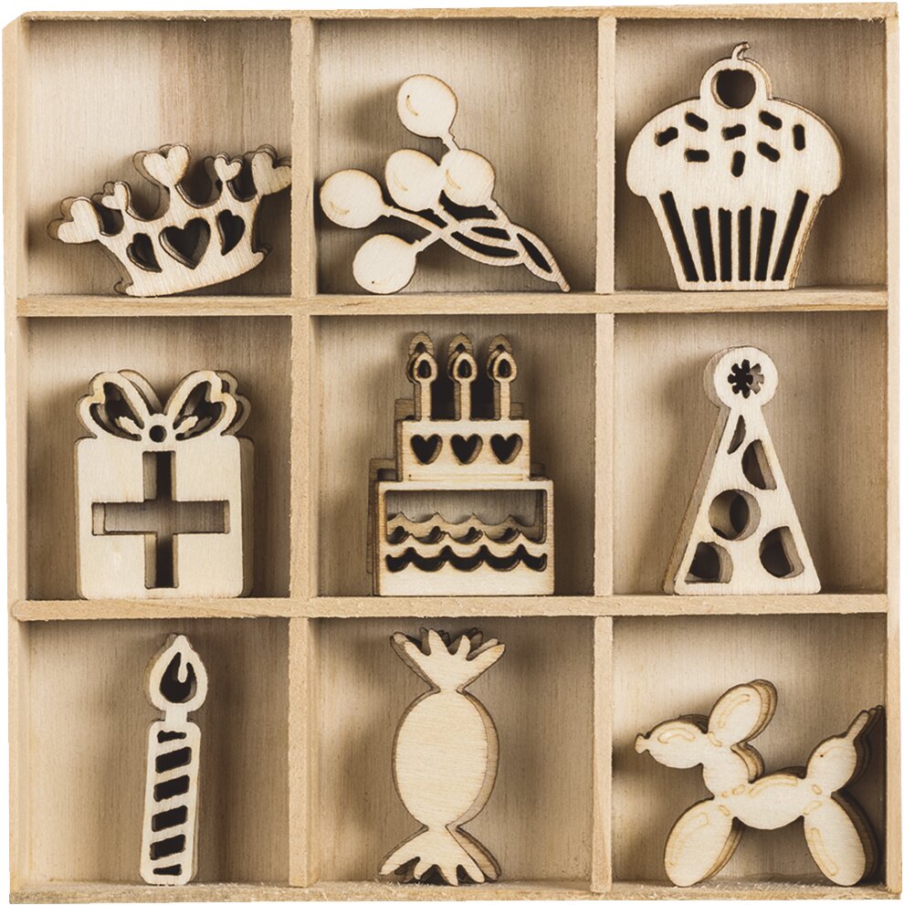 Dřevěné ozdoby v boxu 45ks - narozeniny - 9 motivů po 5 ks, rozměr motivu: 3x3cm.