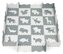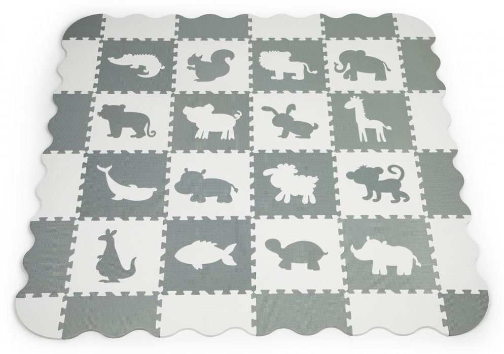 Pěnové puzzle se světle šedými a bílými dílky pro děti od 3 let. Koberec má vyjímatelné dílky ve tvaru různých zvířátek (delfín, ovečka, lev, žirafa, veverka, ...). Balení obsahuje 16 čtvercových dílků, 16 okrajových dílků a 4 rohové dílky. Bezpečná a měkká podložka je omyvatelná, tlumí hluk a izoluje od chladu, je proto ideální jako hrací koberec nejen do dětských pokojů.