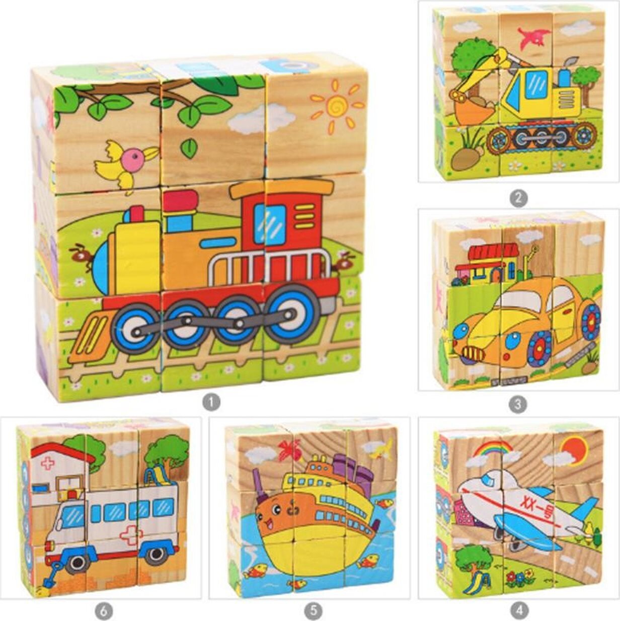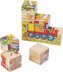 Drewniane kostki obrazkowe służą nie tylko jako układanka, ale także jako pierwsze proste klocki konstrukcyjne, szczególnie do popularnej zabawy - budowania i burzenia wież. Dziecięce kostki ćwiczą u najmłodszych wyobraźnię i sprawność manualną palców. Starsze dzieci podczas układania obrazków rozwijają fantazję, orientację i myślenie logiczne, a kostki motywują je do opowiadania historii.