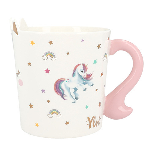 Hrneček ve tvaru jednorožce Ylvi, S potiskem a nápisem : Be happy like a unicorn.