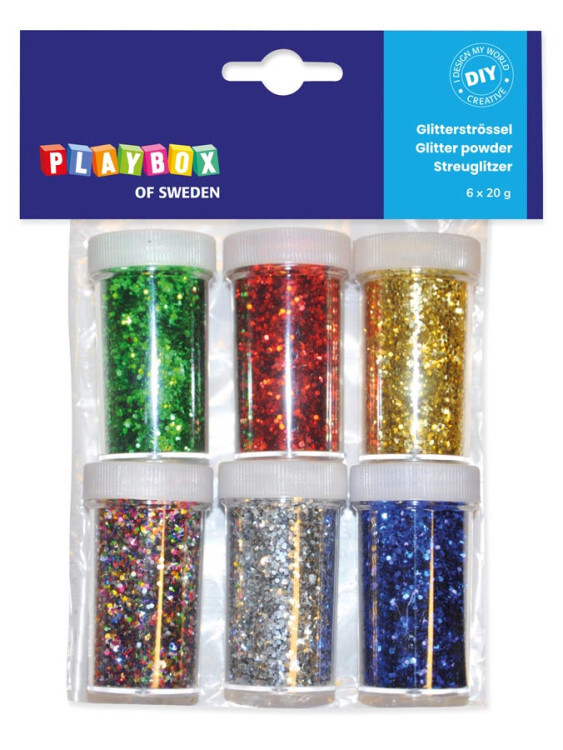 Barevný třpytivý písek.Obsahuje : 6 ks á 20g (  zlatá, červená, modrá, zelená, stříbrná, mix)Materiál: PET przeczytaj całość