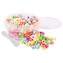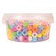 Opakowanie zawiera około 300 sztuk koralików w różnorodnych pastelowych i intensywniejszych tonacjach, w tym białe, żółte, pomarańczowe, jasnoróżowe, różowe, fioletowe, niebieskie i zielone. Każdy koralik ma średnicę 9 mm, co jest idealnym rozmiarem do różnych rodzajów biżuterii, dekoracji czy projektów DIY. Koraliki są przechowywane w praktycznym pojemniku o średnicy 10 cm i wysokości 5 cm, dzięki czemu łatwo je uporządkować i przenosić.