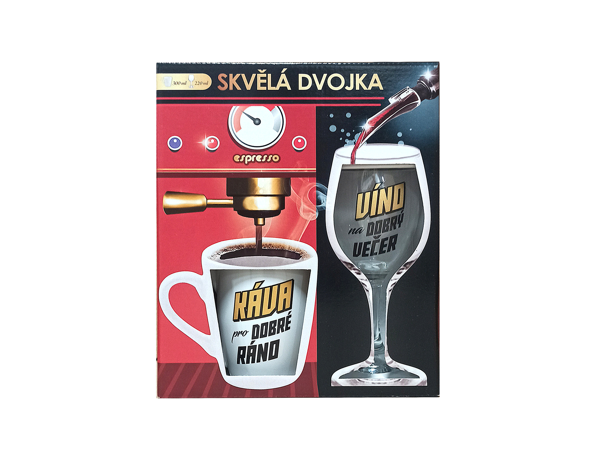 Dárkový balíček "Skvělá dvojka" obsahuje hrneček na kávu a sklenici na víno. Rozměr balení: 200 x 90 x 240 mm przeczytaj całość