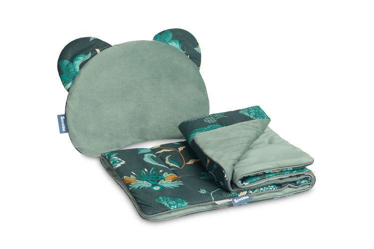 W skład kompletu wchodzi śliczna poduszka z uszami misia oraz kołderka z delikatnym wypełnieniem włókniną silikonową. Dwustronny komplet jest wykonany z wysokiej jakości materiałów - kolorowej bawełny oraz bardzo przyjemnej tkaninyvelvet, która utuli każdego bobasa. Komplet idealnie sprawdza się w wózku, łóżeczku, kołysce czy jako mata dla maluszka. Sama poduszka może służyć jako przytulanka. Wysoką jakośćwykonania podkreśla estetyczna wypustka