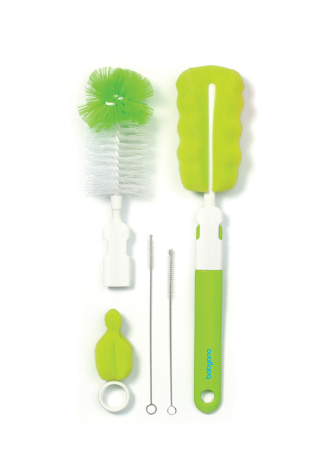 Praktyczny zestaw zawiera dwie wymienne końcówki: jedną ze szczoteczką z miękkim włosiem do delikatnego, lecz skutecznego czyszczenia oraz drugą z elastyczną gąbką, która dotrze do wszystkich zakamarków butelki. Dodatkowo w zestawie znajduje się specjalna gąbka przeznaczona do czyszczenia smoczków, która pomaga usunąć zabrudzenia i bakterie.