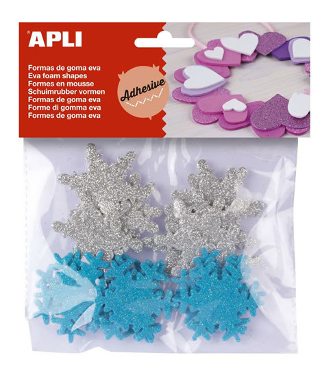APLI pěnovka tvary - sněhové vločky se třpytkami samolepicí, mix velikostí, barev 22 ks